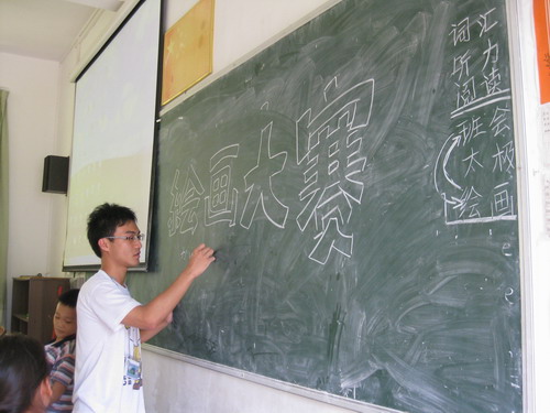 赛前准备:队员在黑板画大字