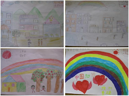 孩子们的画作透露着调皮和天真,描绘的景物有太阳、向日葵、彩虹、楼房等;一些孩子的画中也出现了救援车、救助站以及可移动房屋等设施。同学们的画作重点并不一致,但无不充满对受灾群众的爱。