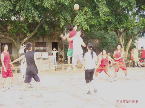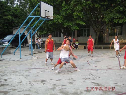 本网讯 7月18日傍晚,太阳刚刚西斜,热气稍稍退去,黎溪中学的篮球场上传来阵阵的喝彩声。由中文学院黎溪三下乡服务队和镇政府干部组成的联队与教师队之间的友谊篮球赛正在这里激烈地进行着。