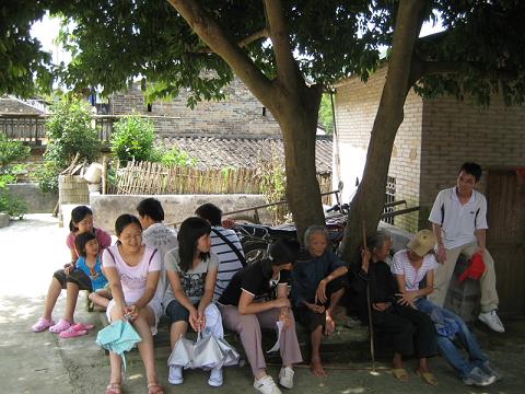 走出大叔家,队员们看到两位老婆婆在一棵大树下乘凉,便一同上前跟她们聊天。其中一位老婆婆得了白内障,另一位老婆婆听力不好。两位老人家的子女都外出打工,工作繁忙,难得陪伴她们身旁,只有五六岁的孙子留在家中。老婆婆与队员们交谈甚欢。