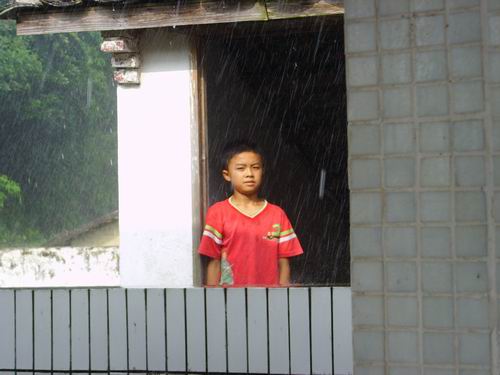 绿光服务队来到下洞村的第二天下午,天下着倾盆大雨。小昌辉在门口避雨,一副欲言又止的样子,队员们便主动上前跟他交谈。在谈话中,他表示,他渴望了解外界事物,非常欢迎绿光服务队的到来。通过简短的交谈我们了解到他喜欢运动。