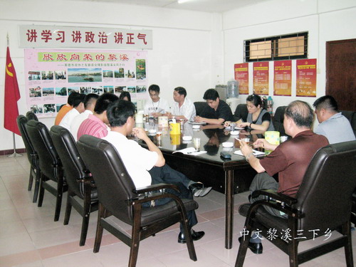 根据行程的安排,下午,当地政府与下乡队伍在黎溪镇镇政府会议室举行了见面座谈会。会上,镇党委委员吴继详首先对本次下乡活动作了简单的介绍,并对下乡队伍的到来表示热烈的欢迎。同时,吴继详对下乡队员的食宿问题作了细心的安排,还特别强调了队员的纪律和安全问题。义教队队长张翠和挂职队队长吴耀华亦分别向与会领导介绍了下乡队伍的情况,同时也向当地领导作出了承诺——所有的队员将严格遵守三下乡的行为守则,立志将服务与实践理念落实到底。