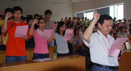 “我志愿加入中国共产党,拥护党的纲领,遵守党的章程,履行党员义务,执行党的决定,严守党的纪律,保守党的秘密,对党忠诚,积极工作,为共产主义奋斗终身,随时准备为党和人民牺牲一切,永不叛党。” 153名新党员在该院党委书记、常务副院长吴昶新的领誓下进行宣誓。