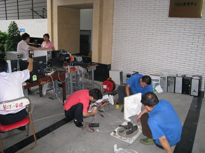尽管台风来袭,天降大雨,物业公司的工作人员仍然接到了许多学生搬来的故障电器。与往常一样,电脑成为了等待维修的大军:六教空地上摆放着数台主机,物业公司的工作人员也积极地投入到维修工作中。据广房物业的负责人介绍,截止至16:00,广房物业工作人员已经完成了对现场20多台电脑的维修工作。