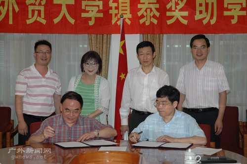本网讯 6月27日上午,广东外语外贸大学镇泰奖助学金签约仪式在北校区行政楼第三会议室举行。镇泰集团名誉董事长、慈善基金会主席、我校第二届董事会董事李治元与校长徐真华续签了三年总额为30万元的“镇泰奖助学金”协议书。
