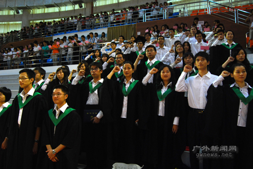 08届毕业生是进驻大学城广外的第一届,肩负着将南北两校文化连接的使命。他们是师弟师妹们学习的榜样。信息学院07级学生杨慧瑗代表在校学生向毕业生们送去祝福。此时此刻,她满怀羡慕之情,也难掩感伤。“时光如梭,往事如歌,你们即将从大学的港湾驶向社会的大海洋,愿你们在新的人生道路上鹏程万里!” 志愿者毕业生赢满场掌声 毕业宣誓拉开人生新篇章