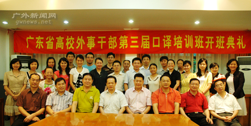 本网讯 6月15日下午,北校区行政楼第二会议室举行了第三期广东高校外事干部英语口译培训班开班典礼。副校长仲伟合,广东省教育厅外事处处长梁永洪,广东省高校外国文教专家委员会会长胡亦武,副会长仲铭锦,副会长、我校国际交流处处长焦方太,翻译学院党委书记梁学宏,翻译学院副院长余东,MTI中心主任赵军峰、翻译学院詹成等任课教师以及参加此次培训的15名学员出席了此次开班典礼。