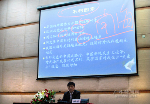随后,他着重阐述了中国企业在全球化潮流下“走出去”战略实施的优势和劣势。首先,中国综合国力的上升以及中国国际影响力的增强都为中国企业实施“走出去”战略奠定了基础,但是近年来人民币的不断升值、能源价格的上涨、美国次贷危机的国际传导以及中国政府的宏观调控政策都给中国企业带来新的挑战。