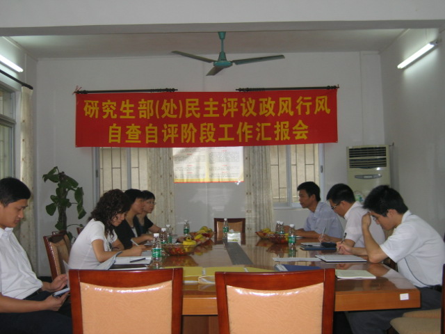 本网讯 6月5日上午,广东外语外贸大学“行评”督导组到研究生部(处)检查行评第二阶段工作。根据学校《关于做好民主评议政风行风自查自评阶段工作的通知》(广外大党〔2008〕23号)的要求,研究生部(处)全体人员做了充分的准备,以饱满的精神迎接行评督导组的检查。