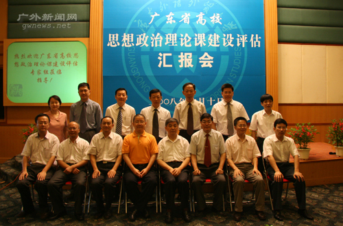 本网讯 6月10日上午,由中山大学博导、全国高校思想政治教育研究会副会长、广东省高校思想政治教育研究会会长、广东省高校思想政治理论课教学指导委员会主任郑永廷教授任组长,南方医科大学人文社科学院院长、广东省高校思想政治理论课教学指导委员会委员邓坤金教授,广东工业大学文法学院院长、广东省高校思想政治理论课教学指导委员会委员谢迪斌教授,深圳大学社科部副主任、广东省高校思想政治理论课教学指导委员会委员刘志山教授,肇庆学院思政部副主任、广东省高校思想政治理论课教学指导委员会委员田杨群教授为成员的的广东省高校思想政治理论课建设评估专家组一行5人莅临我校,在北校区国际会议厅听取我校思想政治理论课建设情况的汇报。