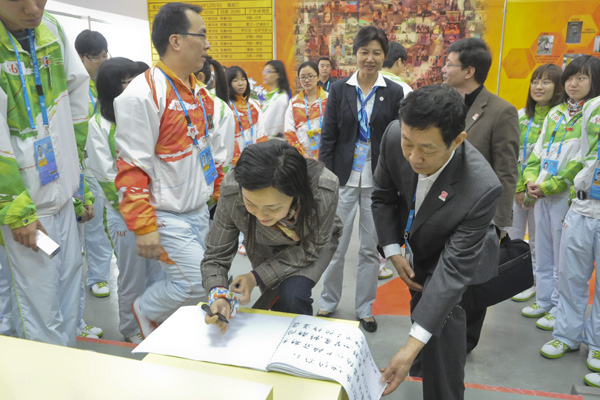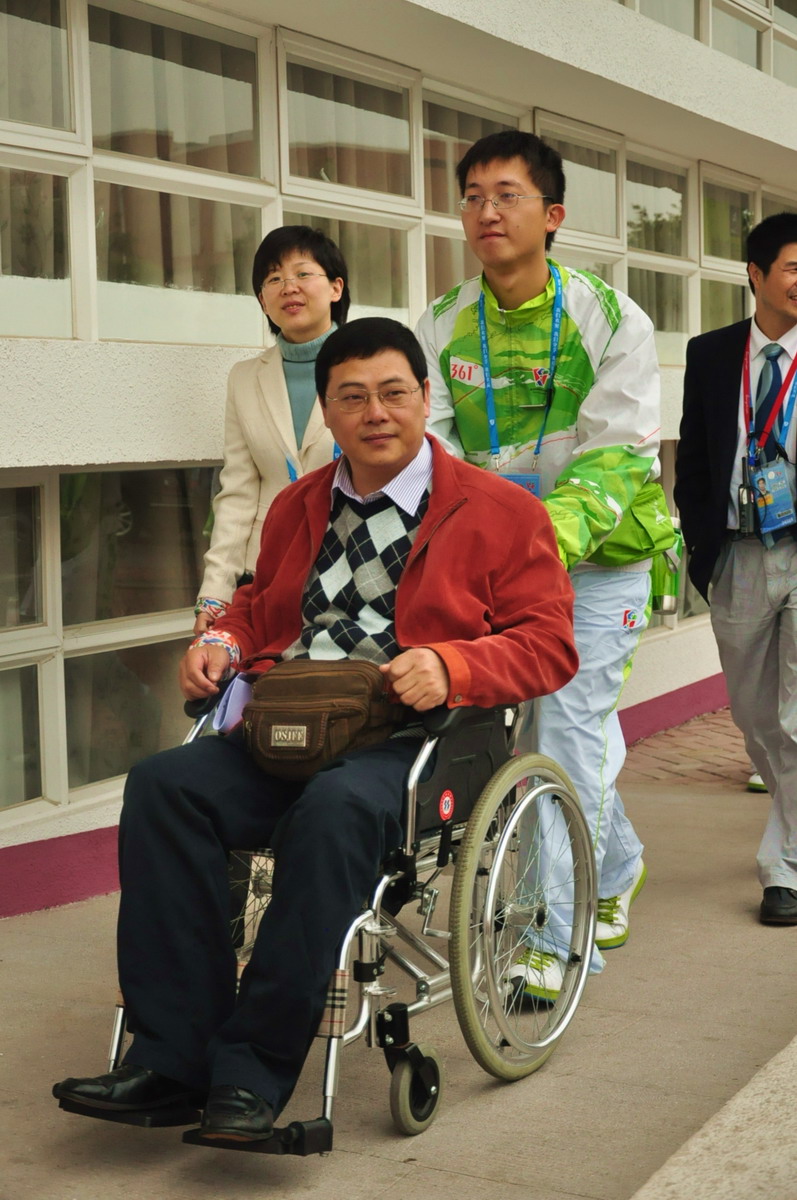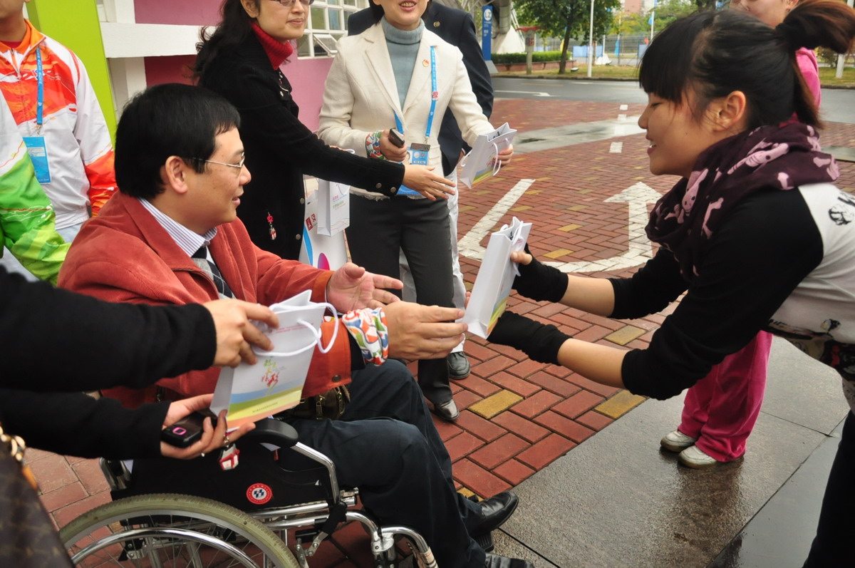 而在经过专业培训的志愿者的陪同下,身坐轮椅的吴小勤一边参观场馆一边与志愿者交流并派发小礼品。他分别慰问了礼宾、媒体运行、体育展示等业务口的志愿者,感谢他们付出的努力,并鼓励志愿者们要坚持下去。在遇到户外站岗的志愿者时,他都会叮嘱几句:“实在不行,脚动一动,别感冒了。”身边的童慧则一再强调,志愿者代表的是广外的形象、广州的形象,应该佩戴好志愿者徽章和志愿彩,统一着装。当来到体育展示业务口的时候,拉拉队的宝贝们正在排练舞蹈,她们随即献舞,并获得了童慧和吴小勤的赞赏。最后,童慧与吴小勤跟志愿者们合照留念。