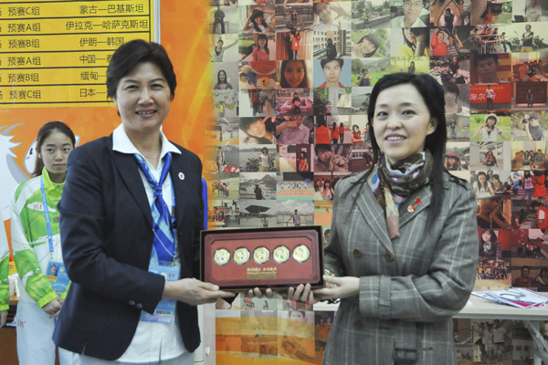 林少娜向曾颖如赠送亚运五羊纪念章(陈奕腾/图)