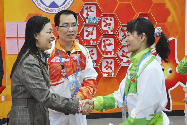 曾颖如一行首先参观了比赛场地,并对我校场馆的设计大加赞赏。随后曾颖如一行来到了场馆的志愿者之家。校党委副书记许国彬致辞,对曾颖如等领导亲临广外场馆指导和慰问志愿者工作表示热烈的欢迎和衷心的感谢,同时也代表志愿者们做出承诺:无论如何广外会承担起重任,经受住委屈和考验,全心全意为亚运亚残服务。
