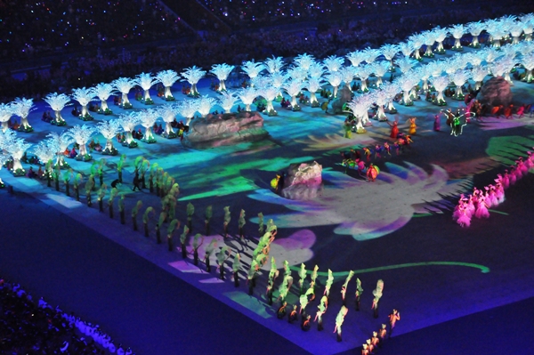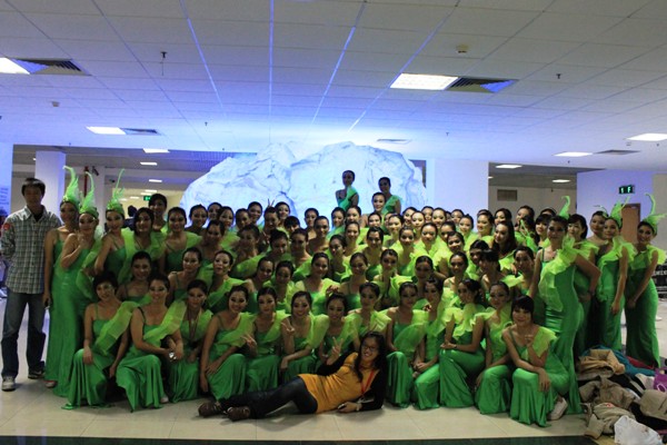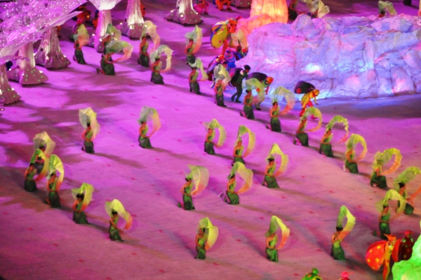 晚上9点左右,《追梦》正式上演,演员们身穿绿色的表演服装,像大自然的绿色精灵轻盈地降落在变幻的地幕上,她们把现场6万多观众引进了一个梦幻的仙境中,优美的舞姿让人陶醉,表演空前的成功!演出谢幕后,由于观众众多,直到凌晨1点左右,演员们和老师才回到学校。