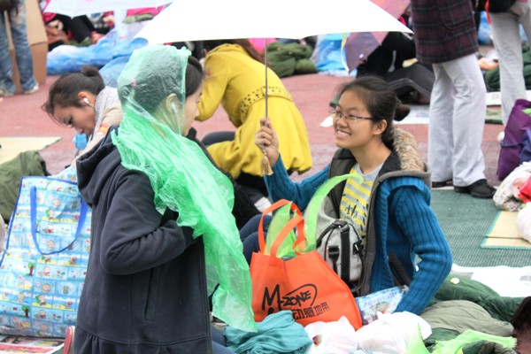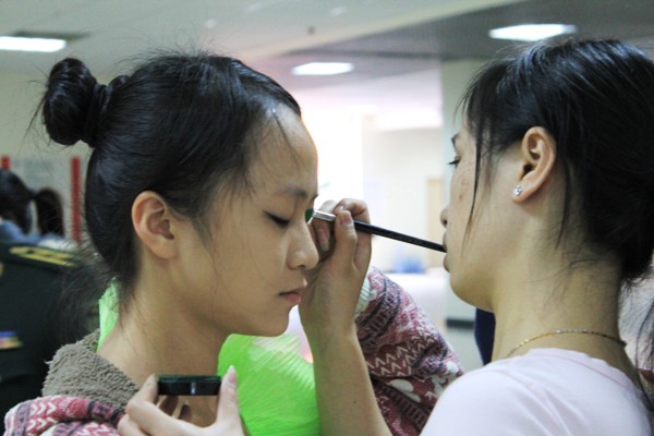 中午12点30分左右,演员们抵达现场。没有专门的等候室,她们自备了席子、报纸;没有专门的化妆间,表演者之间相互帮助完成化妆。我校学生负责表演的《追梦》,正式演出时间是晚上9点左右,但是为做到万无一失,她们早早到场准备,五点半之前已经化好妆,等待入场。
