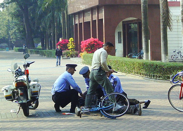 “现在正处于亚运到亚残的转换期,盗窃欺诈事件很多”,针对我校学生最近常常丢失物品这一情况,周知强调,“一定要保管好自己的东西”。他举例道,今天在一饭巡逻的时候伏击人员就目睹了这样一幕——一名在排队的男生发觉到侧兜里的物品被别人掏出,但当他看到盗窃者又把他的物品放回去的时候,他既不报警也不顺手抓住他。周知指出:“他的个人防范意识和社会安全感很差。”