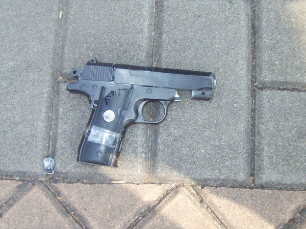 本网讯 12月5日中午,我校保卫处在北校区发现一名行迹可疑的男性。这名犯罪嫌疑人在被查问过程中竟掏出仿真六四手枪进行胁迫和反抗。但是,在保卫处周密安排下,校卫队员最终将其擒获。