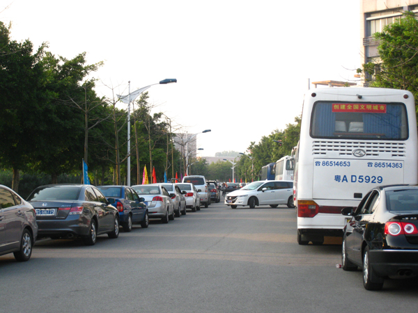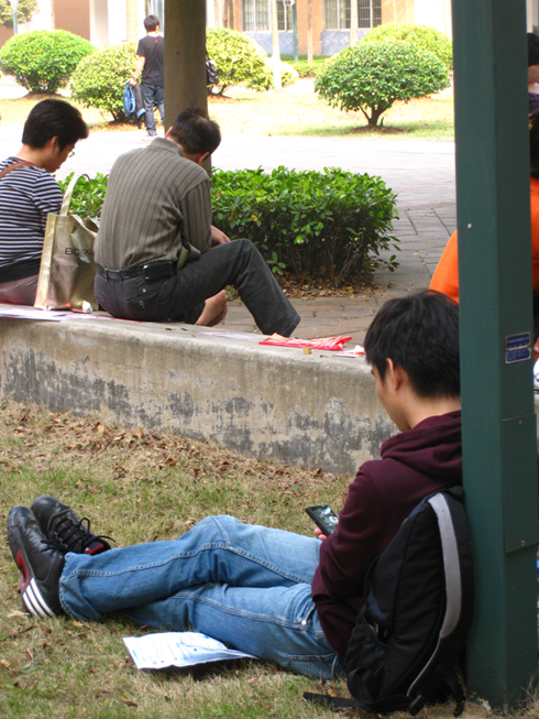 考场外,随处可见就地休息的陪考军团,略显疲惫。来自番禺的林先生此次前来陪女友参加国家公务员考试,从下午开始一直在考场外的阶梯上坐着等候。林先生女友是广州大学应届毕业生,此次前来报考的是珠海拱北海关,两人驾车前来。来自深圳的叶阿姨此次陪同研究生毕业后工作的儿子参加珠海拱北海关的公务员考试。叶阿姨母子俩提前一天驾车来到广州,由于机动车单双号限行,叶阿姨母子只得改乘车进入大学城。下午赶往考场,已感到奔波劳累。