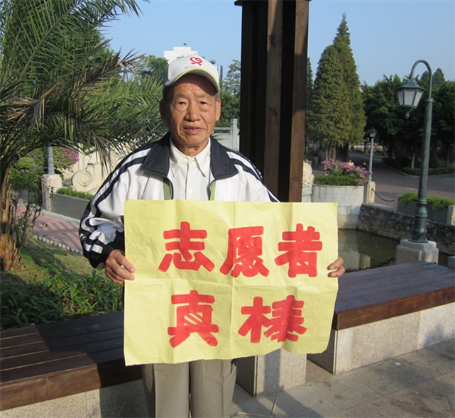 程福安老人手举自制的为志愿者鼓劲的标语 |