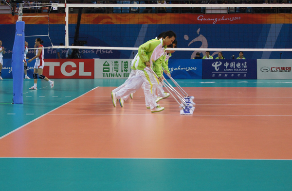 志愿者的岗位有很多,大家各司其职,而其中有些志愿者的工作特别瞩目,如每次比赛暂停时负责拖地板的志愿者。他们由6个男生组成,球网两边各3个,每人手中都拿着一个长拖把。暂停时间一到,坐在场边的他们就会迅速上前排好,以整齐的步伐和一致的速度将比赛场地拖上一遍,动作之快捷齐整十分吸引眼球。