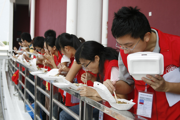 体育场没有桌椅的时候,志愿者只能站着吃饭