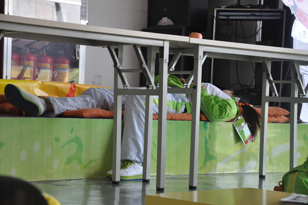 中午的志愿者之家显得非常安静,因为工作了一个上午的志愿者们会在这里午休。由于太累了,志愿者们都顾不上形象,有的趴着,有的头枕着膝盖,有的甚至直接躺在地上睡。黄敏仪是一位负责服务媒体班车的志愿者,记者见到她的时候,她正枕着膝盖午睡。黄敏仪介绍,她每天五点多就要起床上岗,到晚上十二点多才能回去,由于困倦,每天中午都要在志愿者之家休息一下。