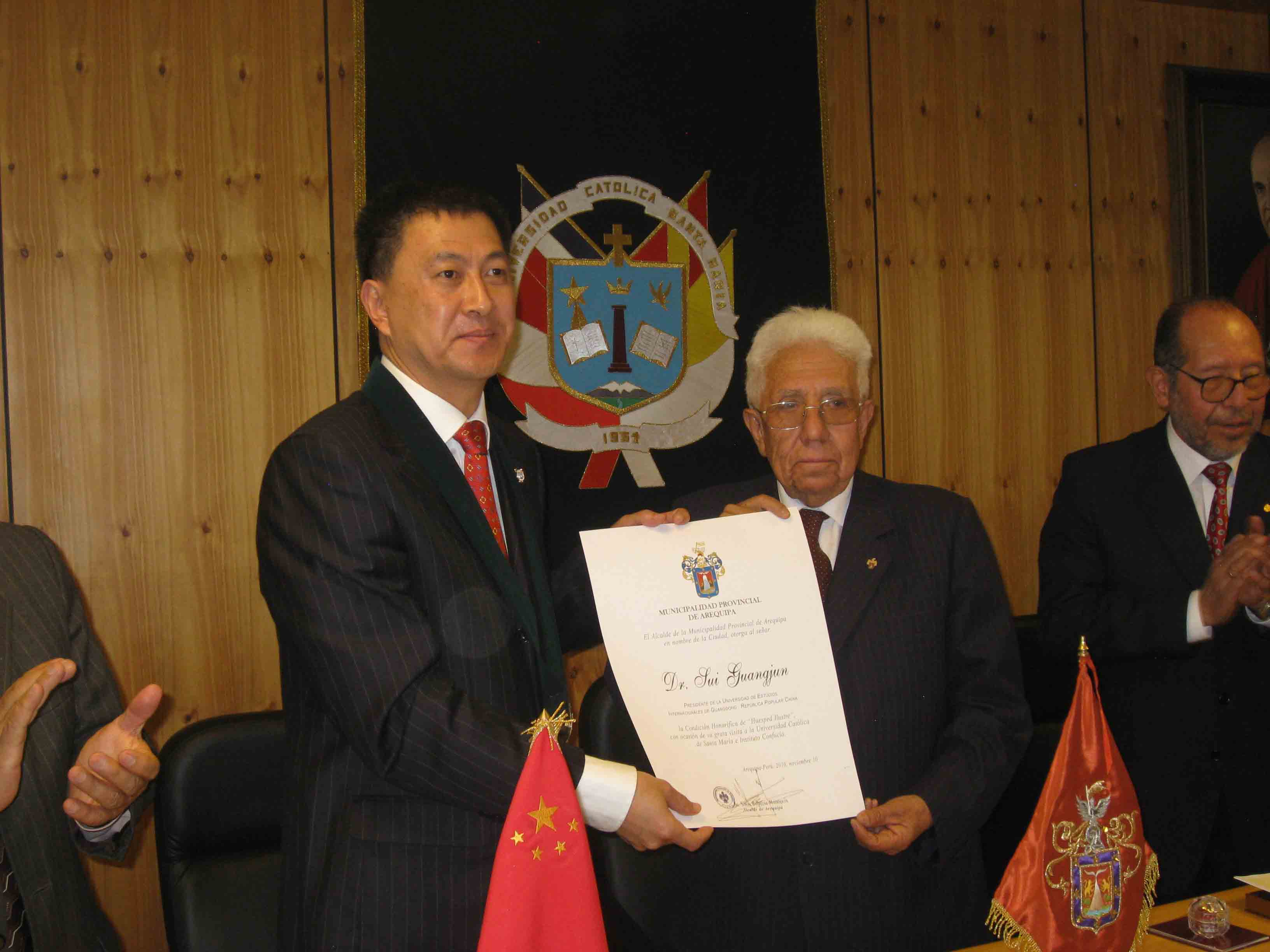 11月10日上午,双方进行了工作会谈。阿贝尔、胡琉、副校长加斯帕尔、以及工程技术学院院长、法学院院长、经管学院院长以及教育学院院长等出席了座谈会。座谈会后,阿贝尔亲自为隋广军颁发证书,授予他圣玛利亚天主教大学荣誉学者称号;隋广军还与阿贝尔一起,为新成立的圣玛利亚天主教大学亚太研究中心揭牌。随后,阿雷基帕市长西蒙·巴尔布宜纳来到了座谈会现场,亲自授予隋广军为阿雷基帕市荣誉市民。在答谢辞中,隋广军指出,获得阿雷基帕市荣誉市民称号,他感到十分激动,来到阿雷基帕市,他一直感受着这座城市的神奇、美丽和伟大,他一定会为促进广州与阿雷基帕友好城市的发展作出自己的最大努力。