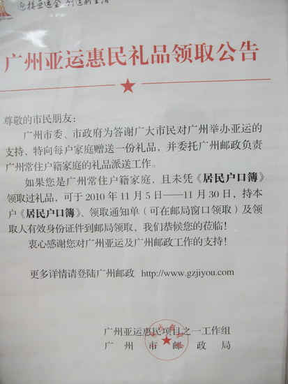 本网讯 11月24日记者在大学城中山大学邮局走访时发现,由广州市委、市政府开展的向每户家庭赠送一份礼品的活动已经接近尾声,但是前来邮局领取礼品的同学并不多。记者特意询问了邮局工作人员,工作人员表示,该邮政局平均每天派送出30份左右的礼品,相对于广州市区内每天派送出几百到上千份来说,数量是比较少的。他们认为,主要原因是一些符合条件同学还不知道这个活动,截止日期将至,希望尚未领取礼品的同学把握住最后的机会。另据记者采访结果来看,很多同学仅仅是知道有这条政策,但不了解具体领取方式,或是等待学校通知。