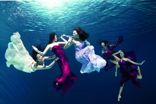 罗茜(左起第二)和队友一起拍亚运花样游泳大片(图片来源:网络)