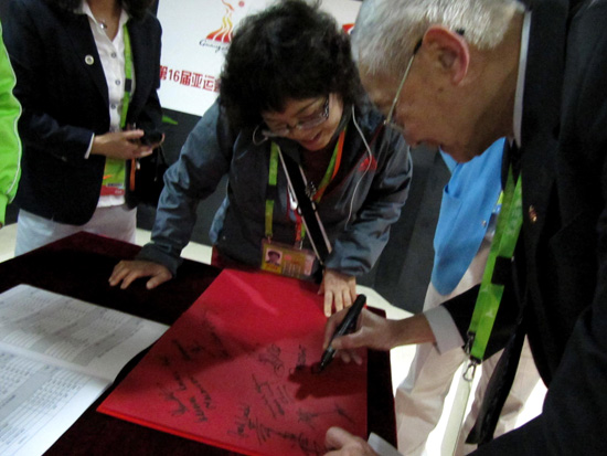 在泰国前总理Banharn Silapa-archa临走前,记者在我校东语学院学生的帮助下,顺利地对他进行了采访。Banharn Silapa-archa用“漂亮、宽广、整洁和舒适”几个形容词来描述我校场馆,他还盛赞场馆内的工作人员和志愿者们“非常努力”。而对于泰韩两支女排队伍交锋,Banharn Silapa-archa清楚看到了泰国女排在身高方面的劣势,不过,“女排们在场上奋力拼抢每一分,这已经足够了。”泰国与亚运渊源颇深,至今已经举办过4届亚运会,Banharn Silapa-archa说希望泰国能够继续承办更多的亚运会。