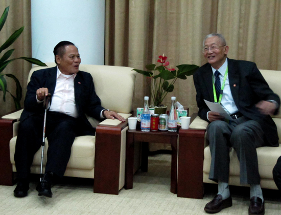 魏纪中(右)与泰国前总理(左)亲切交谈