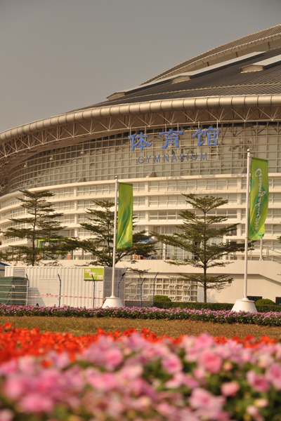 鲜花映衬下的广外亚运场馆(吴力彬/图)