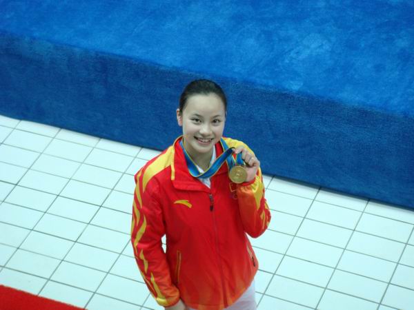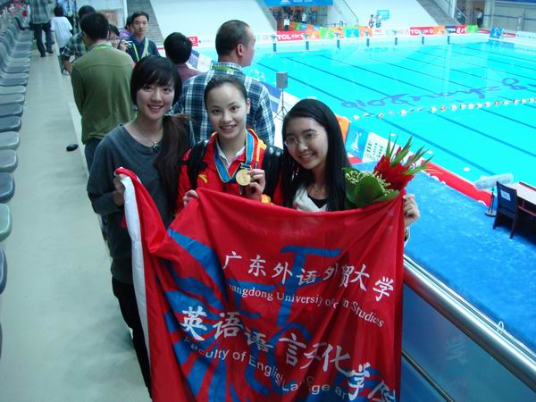 颁奖仪式结束后,罗茜与英文学院师生一起合影留念。罗茜是英文学院09级文传7班的学生。今年,为了亚运训练她总是“在线隐身”的状态,很少看见她的身影,但是老师和同学们都很关心和支持她。见到为她加油的师生,她开心地笑起来。