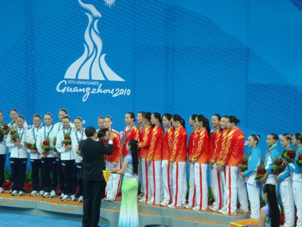 本网讯 11月21日在佛山世纪莲体育馆,广东外语外贸大学英文学院的体育精灵罗茜同学在亚运这个大舞台上荣获冠军,与她的同伴携手展示了我国花样游泳队的大气、魅力和风姿。