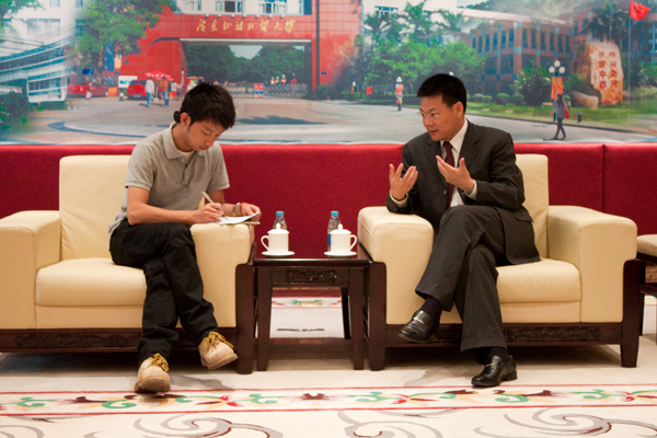 仲伟合首先向央视记者们简要介绍了我校师生参与亚运志愿者服务的情况。仲伟合以“亚运的声音通过广外传到全世界;亚运的形象也通过广外传到全世界。”两句话高度概括广外在协助亚运会语言方面起到的引领作用。