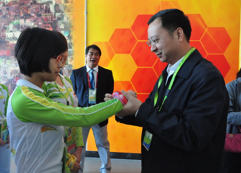 “同学们好!”一看到站在门口的志愿者们,王焕清就热情的向大家招手,“大家都辛苦了。我今天特意来看看同学们。你们用热情和微笑为亚运增添了不少光彩,是我们亚运成功举办的重要力量。接下来的任务还很重,要拜托你们了。”刚到志愿者之家的门口,王书记就发言感谢志愿者们。