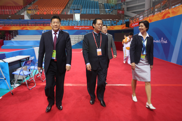 仲伟合首先把宋永忠领到了场馆的贵宾休息室,稍作休息后宋永忠一行来到排球竞赛馆参观。宋永忠对广外亚运场馆的设计大加赞赏,表示这是他所看过的最美的场馆。当得知中国男排刚刚离去,他亦表示很可惜不能一睹国排的风采。