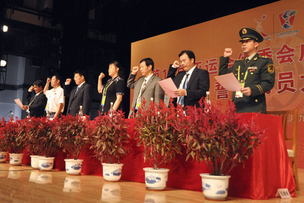 最后,场馆全体服务人员起立,举起右手进行了庄严的宣誓。在“真情奉献,微笑服务,为祖国争光,为亚运添彩”的洪亮誓词中,本次的誓师动员大会完满结束。