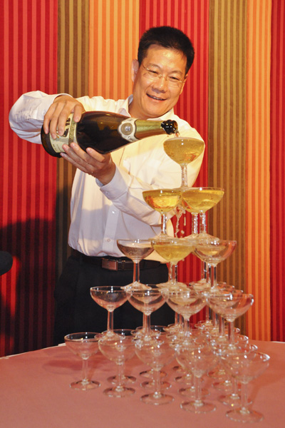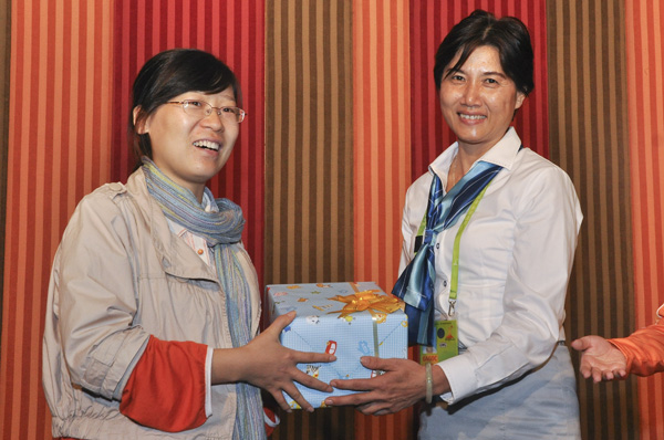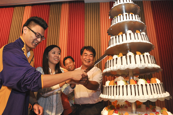 酒会特意为11月生日的工作人员举办的神秘庆生会将气氛推向最高潮,包括人力资源经理何越晖在内的13名工作人员上台接受大家的祝福。“Happy birthday to you,happy birthday to you……”在全场温馨的生日歌声中,陈子锐、顾也力和两位“寿星”一起切蛋糕,并送上小礼物,在祝福他们的同时也预祝亚运会完满举行。随后,体育展示业务口的工作人员上台用手语演绎了《隐形的翅膀》,再次引来台下的热烈掌声。