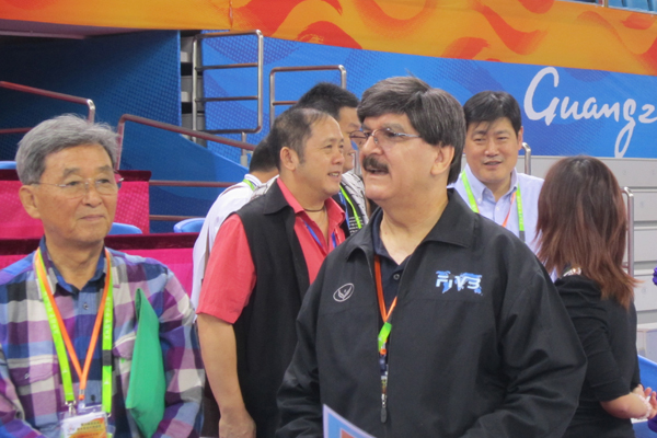 本网讯 11月9日上午,亚运排球联合会管理委员会主席任享彬、技术代表Mr.Shangrit Wongprasert、裁判委员会主任Mr. Mohammad Habib Ali Abdullah、随队裁判骆文棽一行来到广外亚运场馆,在广外亚运场馆执行主任、校长仲伟合,广外亚运场馆竞赛主任蔡毅,广外亚运场馆运行秘书长林少娜、副秘书长李旭武等人的陪同下视察了广外亚运排球场馆。