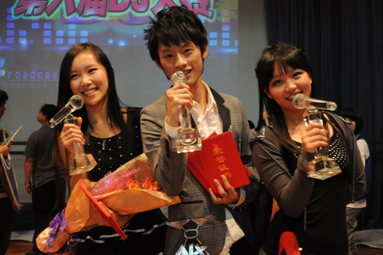 本网讯 11月8日晚上7时,我校第六届DJ大赛于B8学术报告厅精彩上演。出席本次大赛的嘉宾有新闻与传播学院院长郭光华、党委副书记陈华荣、播音与主持专业老师李峻岭。艺术学院老师杨欢,魅力新人王总策划、广东电台新闻台DJ黄纬、飞扬88栏目编辑马静仪以及第五届DJ大赛冠军钟政轩为大赛担任评委。新闻与传播学院播音与主持专业14号的柳州独得4奖,成为当晚最大赢家。