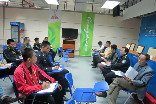 黄炳南指出,临近亚运,各岗位人员已经派发了工作证。安保工作人员必须认真检查相关证件,根据各种工作人员的分类情况,区别不同的人群。自亚运筹备工作开展以来,场馆已经进行了多次演练,黄炳南特别强调了演练的重要性,“要从多次演练中发现问题,然后切实解决”,努力做到细致谨慎、随机应变。另外,黄炳南还要求各位安保工作人员要保持最佳工作状态,微笑服务。