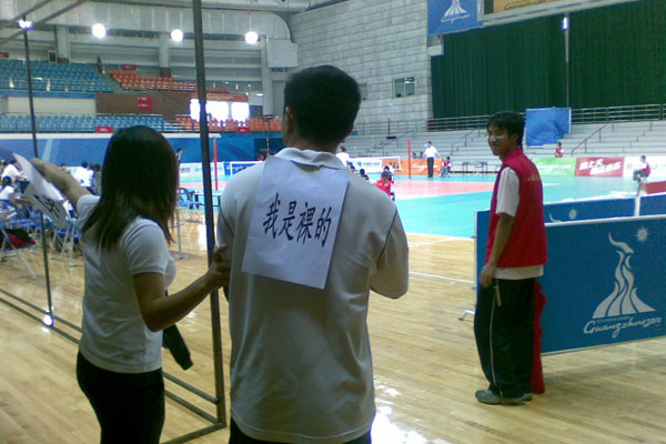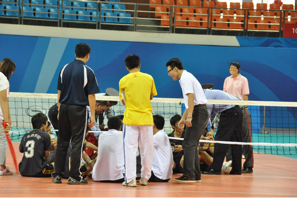 场馆当天的坐式排球联调测试赛,由广外和广药的学校男子排球队分别“扮演”中国台北队与日本队。由于坐式排球的比赛规则要求运动员身体的臀部至肩部之间的一部分必须接触地面,除此之外,击球时允许短暂的离开球场地面,但禁止站立、抬起身体或用脚移动。因此,场上的“残疾人运动员”都是坐在地板上进行比赛。