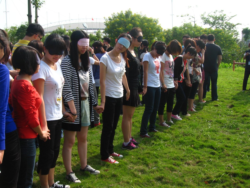 刚到拓展营,志愿者们就被分成了5个小组并进行活动“热身”。每个人都收到了一个眼罩,然后蒙上双眼。在一片黑暗当中,志愿者们要将自己小组的组员按年龄从大到小排列好。志愿者们马上手拉手,肩并肩地行动起来,大家大声地报出自己的生日年月,并摸着同伴的手,小心翼翼地前后挪动。虽然看不见,但凭着同伴的帮助,志愿者们在很短的时间内就按要求排列好了队伍,并推举出组长。