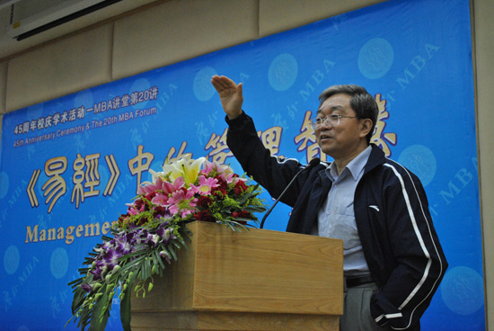本网讯 “《周易》以前的好多解法是错的,对号入座会解死《周易》。”10月14日下午,我校45周年校庆系列学术活动之一、MBA讲堂第20讲——“《易经》中的管理智慧”在北校区图书馆负一层报告厅举行,此次讲座由我校栾栋教授主讲,广州培正中学校长吕超,我校党委宣传部部长孔晓明,人事处处长方迎生,留学生教育学院院长梁学宏等出席了讲座。讲座由MBA教育中心主任孙建军主持。