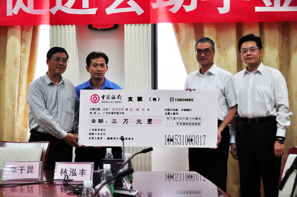 在全场热烈的掌声中,叶景文代表穗港青年交流促进会向我校捐赠助学金,杨敏生代表学校接受捐赠,并向穗港青年交流促进会赠送了校园纪念品,为捐赠人颁发了捐赠证书。