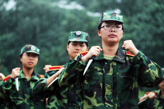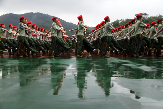本网讯 适逢第11号台风“凡亚比”肆虐,我省近日也被牵连其中,暴雨不断。9月21日下午,纵使天公不作美,阴雨绵绵,但我校5000余名2010级新生以飒爽的军姿和雷霆般的呐喊,上演了一场壮观的军训阅兵礼,以此告别长达15天的军训生活。男子长枪术、女子匕首操等表演引人入胜。而“女子海军陆战队”方阵则是首次亮相阅兵环节。