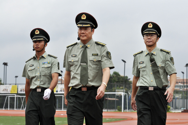 仲伟合(中)、陈建平(右)身着戎装,巡场检阅