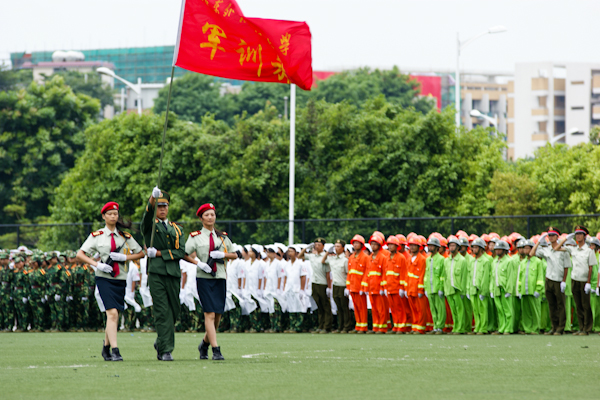 当嘹亮的国歌声响起时,全体肃立,所有人面向国旗行注目礼,气氛庄严肃穆。主旗手紧握写有“广东外语外贸大学军训旅”的军旗潇洒走过,观者对军旗致以最崇高的军礼。随着熟悉的音乐响起,阅兵总指挥卢伟华从最左边的持枪方队开始,对部队进行一一检阅。新生们“首长好”、“为人民服务”的声音铿锵有力,神情坚毅昂然。