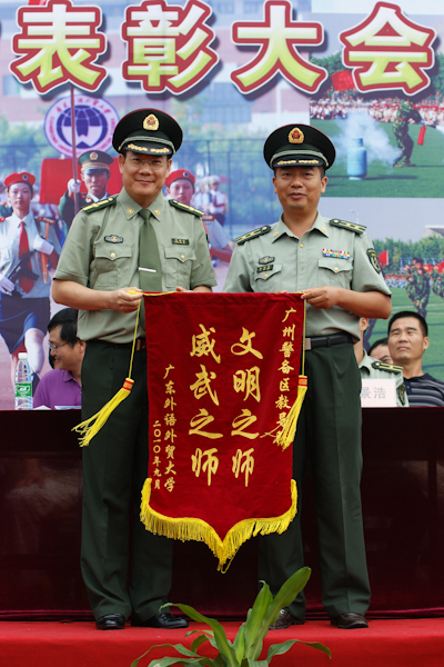 陈建平在总结中指出,此次军训为广州亚运和我校45周年校庆献上了一份弥足珍贵的礼物,充分展示新一代大学生令人振奋的风采。顾也力宣读了军训表彰名单,仲伟合则向部队赠送锦旗。而颁奖过后,是同学们与教官们的离别之时,有些同学红了眼眶、落了泪。